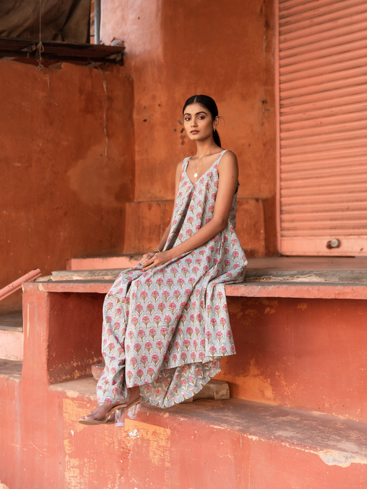 Blue Lotus Drape Jumpsuit - Blue Cotton Hand Block Printed Drape Jumpsuit