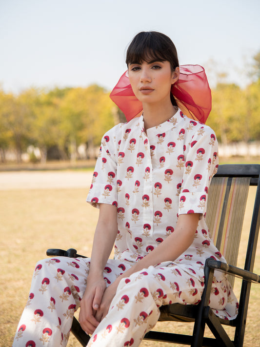 Marigold Co-Ord - White Red Hand Printed Cotton Co-Ord Set