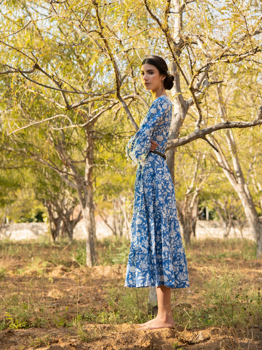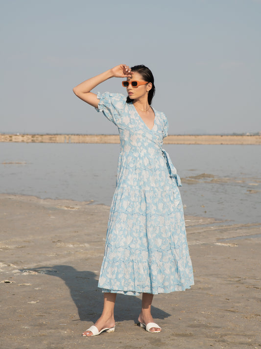 Blue Lilies Tier Wrap Dress - Blue Hand Block Printed Cotton Tiered Dress