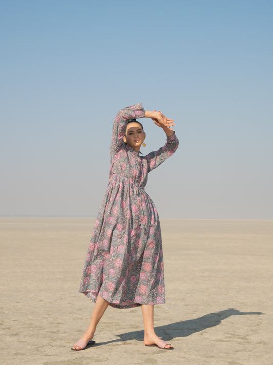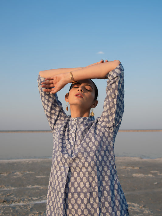 Grey Gloria Shirt Dress - Grey Hand Block Printed Cotton Shirt Dress