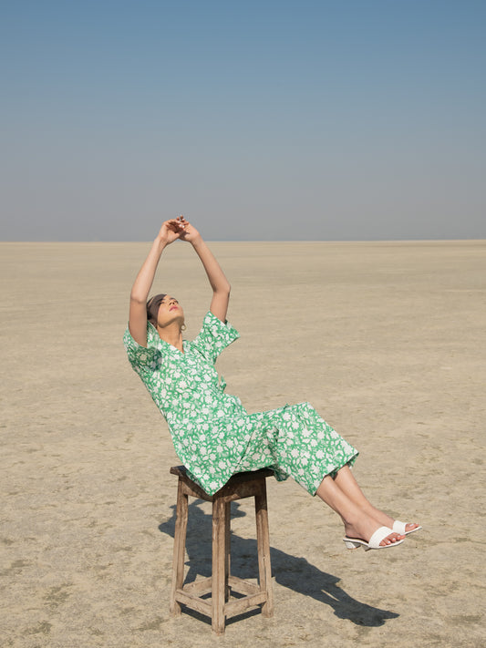 Green Basile - Green Hand Block Printed Cotton Kimono Style Co-ord Set