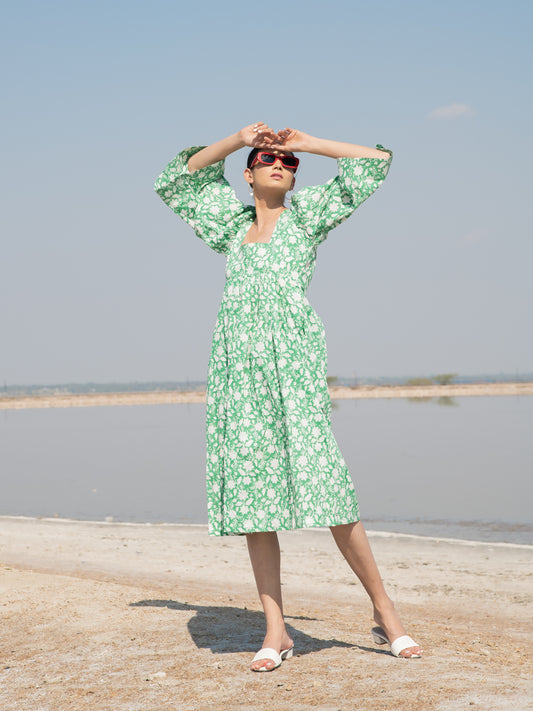 Green Basille Victoria Dress - Green Hand Block Printed Cotton Dress
