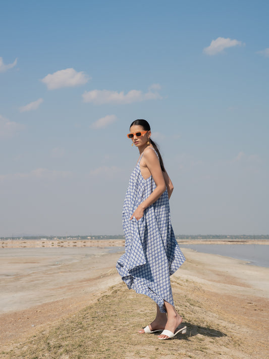 No More Blues Tier Dress - Blue Hand Block Printed Cotton Tier Dress