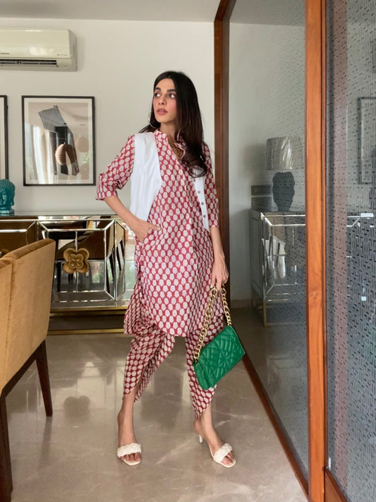Red Lotus Dhoti Co-Ord Set - Red Hand Block Printed Cotton Dhoti Co-ord Set