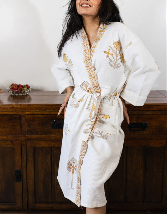 Mogra Garden Luxury Block Printed Cotton Bath Robe