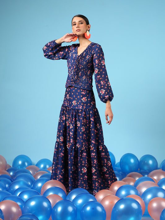 Bouquet On Blue Skirt - Blue Digital Printed Cotton Silk Tiered Skirt