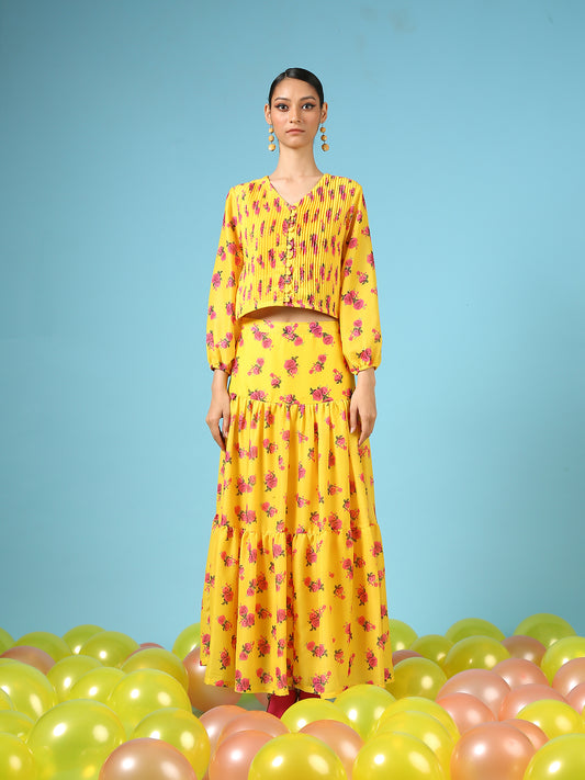Rose Sunshine Skirt - Yellow Digital Printed Cotton Silk Tiered Skirt