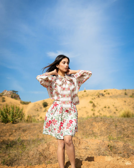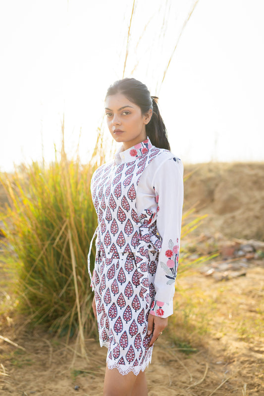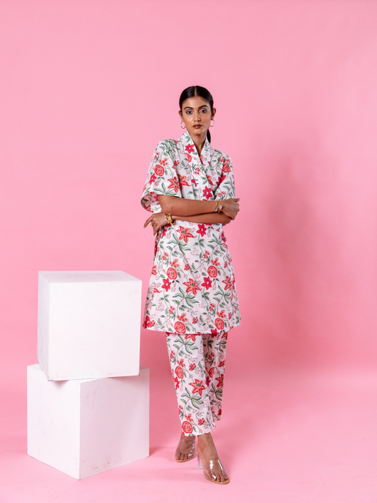 Marigold Co-Ord - White Red Hand Printed Cotton Co-Ord Set
