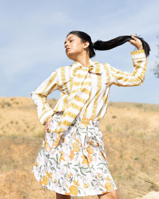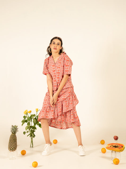 Sacha Flounce Skirt Co-ord - Multicolour Hand Block Printed Cotton Shirt Style Top And Ruffle Detailed Skirt