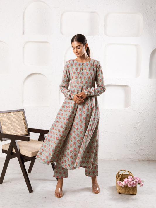 Grey Pansy Kurta Set - Hand Block Printed Kurta Set