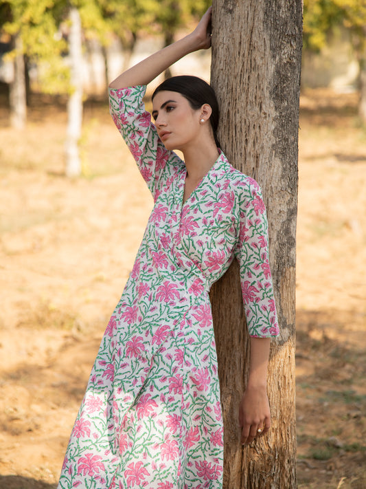 White Gardenia Wrap Set- White Pink Hand Block Printed Cotton Wrap Kurta with Pants