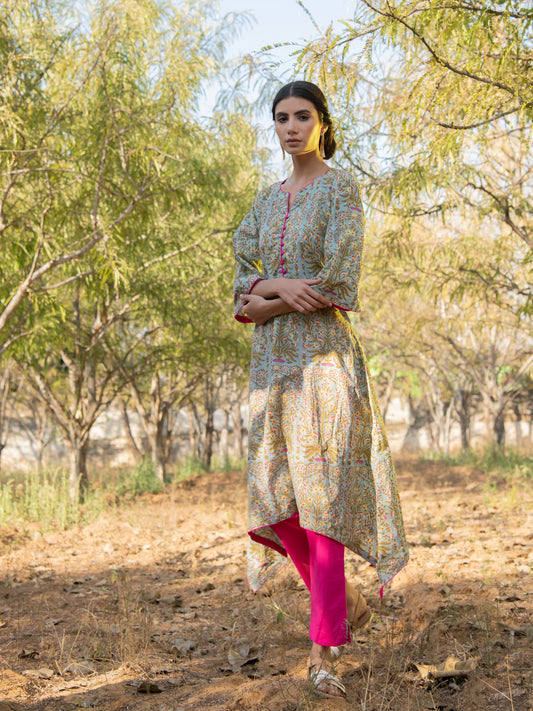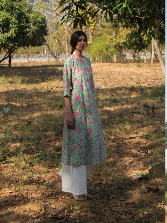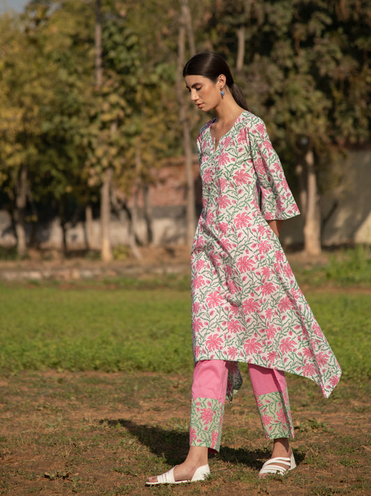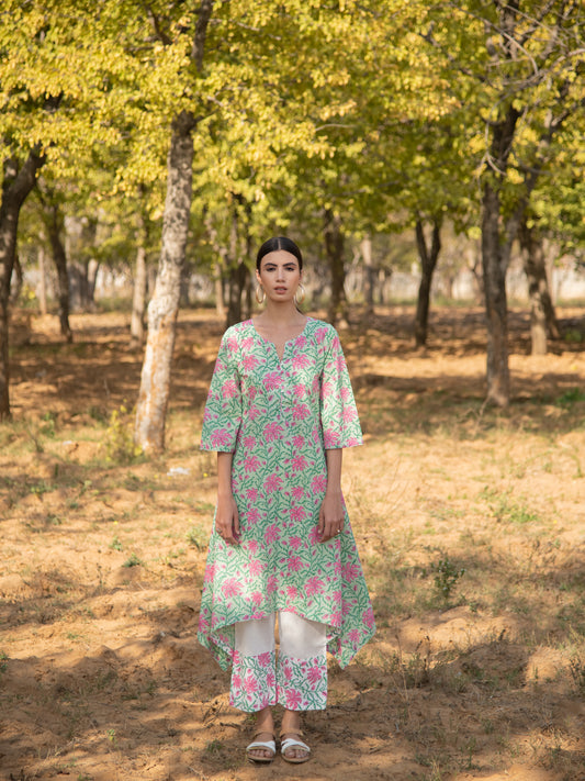 Green Gardenia Kurta Set- Green Pink Hand Block Printed Cotton Asymmetric Kurta with Pants