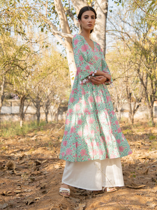 Green Gardenia Tier Set- Green Pink Hand Block Printed Cotton Tier Kurta Set