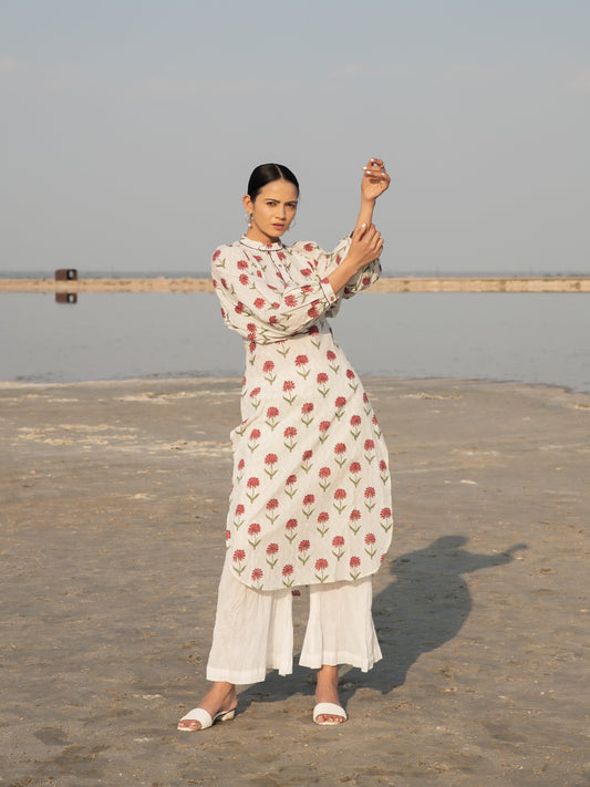 Carnations Kurta Set - White Hand Block Printed Cotton Kurta Set