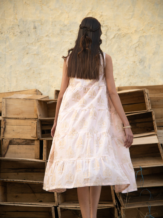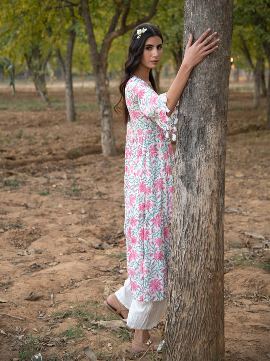 White Gardenia Tier Set- White Pink Hand Block Printed Cotton Tier Kurta Set