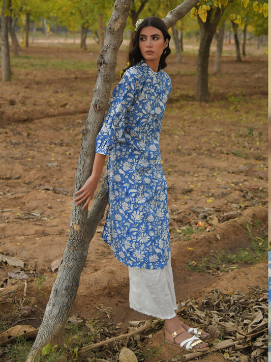 No More Blues Kurta Set- Blue Hand Block Printed Cotton Kurta With White Crushed Pants