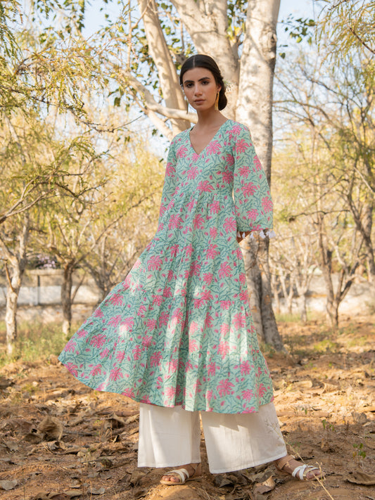 Green Gardenia Tier Dress - Green Pink Hand Block Printed Cotton Tier Dress