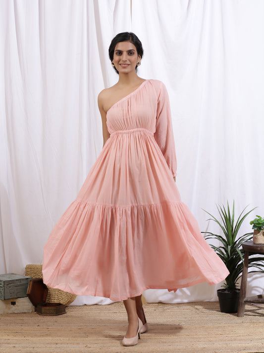 Pêche Dress - Peach Cotton One Shoulder Tier Dress